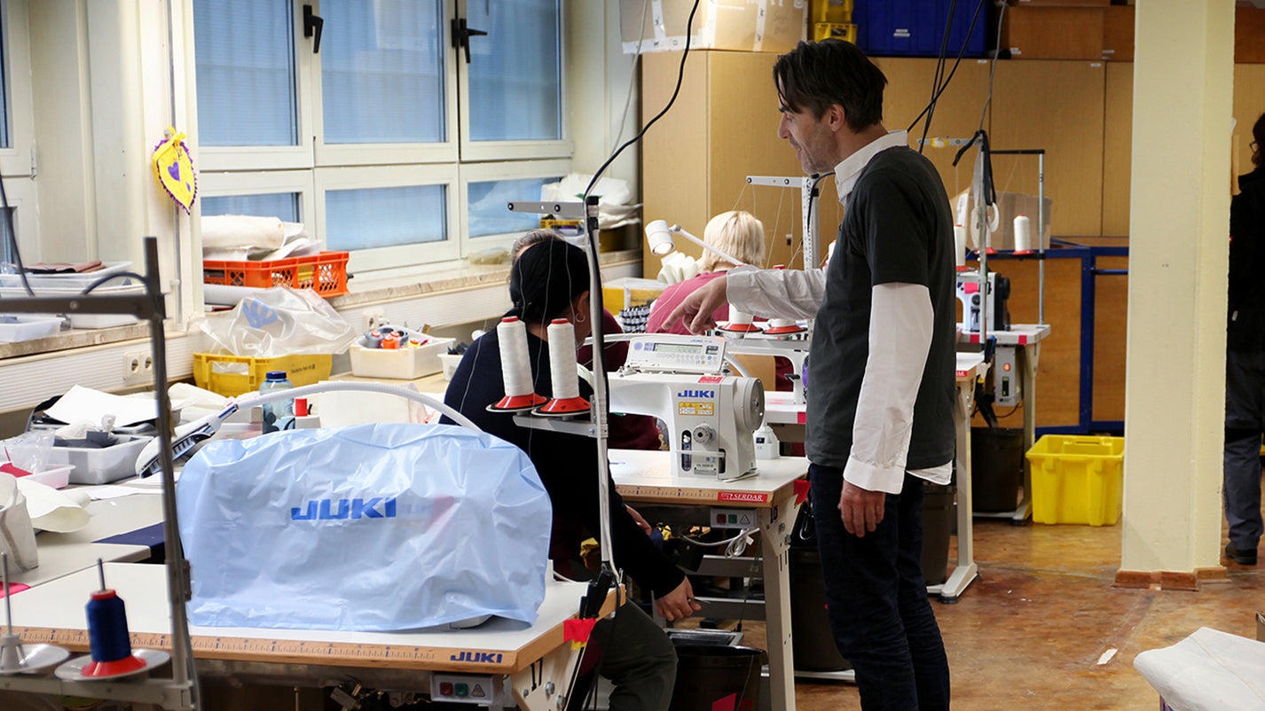 in norddeutschland, genauer gesagt in vechta, etwa 40 kilometer von unserem büro entfernt, nehmen unsere taschen innerhalb der mauern eines frauengefängnisses gestalt an. im rahmen eines resozialisierungsprogramms fertigen inhaftierte frauen diese einzigartigen stücke. dieses programm dient nicht nur als plattform für die entwicklung von fähigkeiten, sondern auch als mittel für diese frauen, sinnhaftigkeit und bestimmung zu finden, die sie brauchen, um im leben nach dem knast wieder in ein normales leben zu finden.