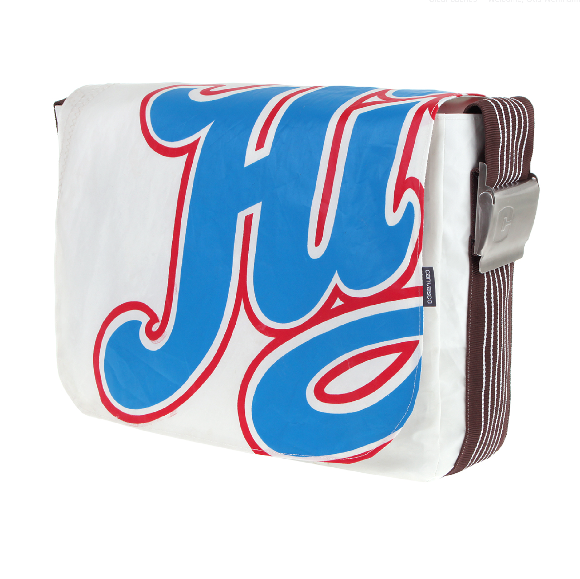 UNIKAT Segeltuchtasche mit Klettverschluss, 1 Hauptfach, 2 kleine und 1 grosse Innentasche mit Reissverschlüssen, 1 Handyfach, 9 cm breiter und längenverstellbarer Tragegurt, mit Edelstahlschnalle, wasserabweisend und waschbar, Leergewicht: 800g, Abmessungen ca. H 30 x B 40 x T 12 cm