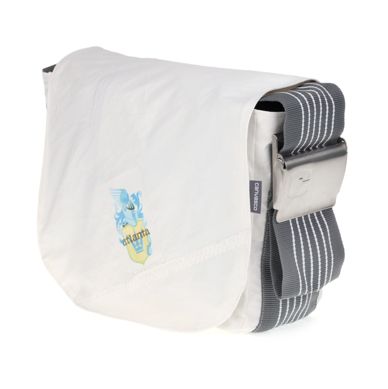 UNIKAT Segeltuchtasche mit Klettverschluss, 1 Hauptfach, 2 kleine und 1 grosse Innentasche mit Reissverschlüssen, 1 Handyfach, 9 cm breiter und längenverstellbarer Tragegurt, mit Edelstahlschnalle, wasserabweisend und waschbar, Leergewicht 700 g, Abmessungen ca. H 22 x B 32 x T 12 cm