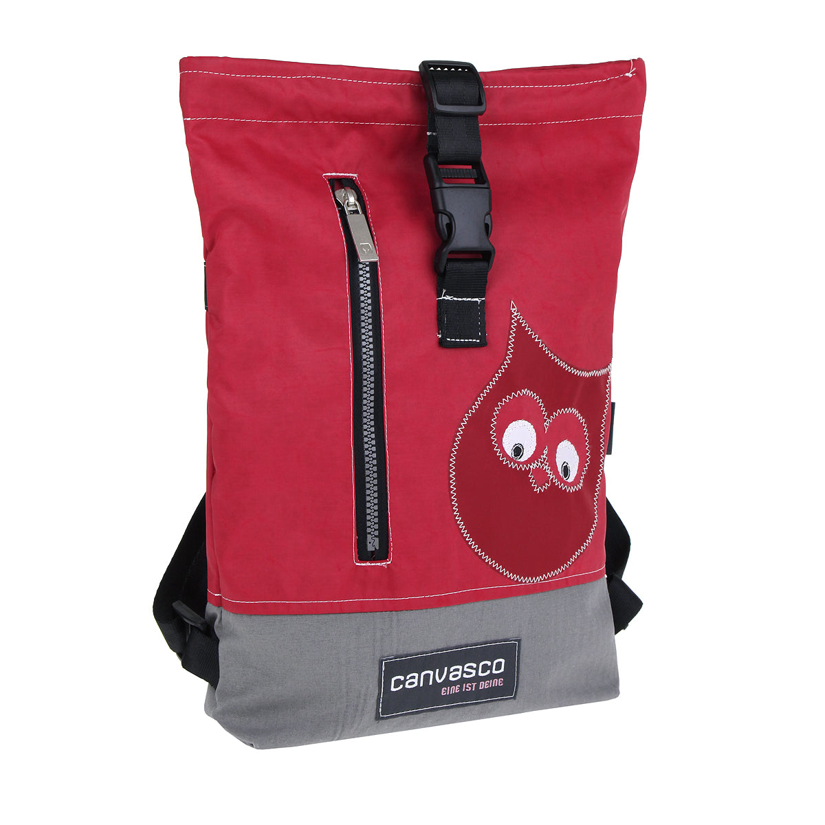 Segel Kinderrucksack mit Kurierfahrradverschluss, 1 Hauptfach, 1 Laptopinnenfach, 1 Seitentasche vorne, Taschenboden farblich abgesetzt, Abmessungen ca. H: 35 cm, B: 25 cm, T: 5 cm