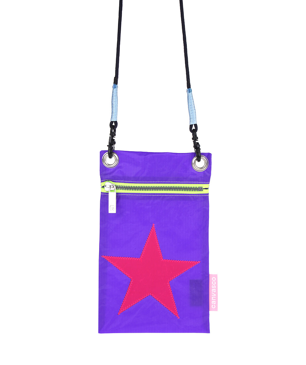 – 100% Handmade in Germany – Neck pouch made of recycled sail, 1 compartment, 1 zipper, 2 eyelets, hand-knotted strap with snap hook, adjustable length, water-repellent and washable H 25 cm x W 15 cm, 120 cm strap