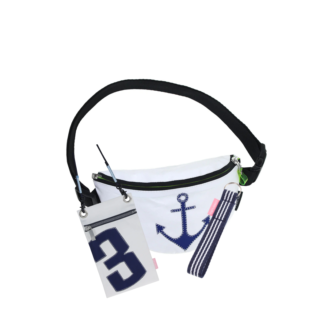 – 100% Handmade in Germany – Brustbeutel aus recyceltem Segel, 1 Fach, 1 Reißverschluss, 2 Ösen, handgeknüpftes Band mit Karabinerhaken, längenverstellbar, wasserabweisend und waschbar H 25 cm x B 15 cm, 120 cm Band